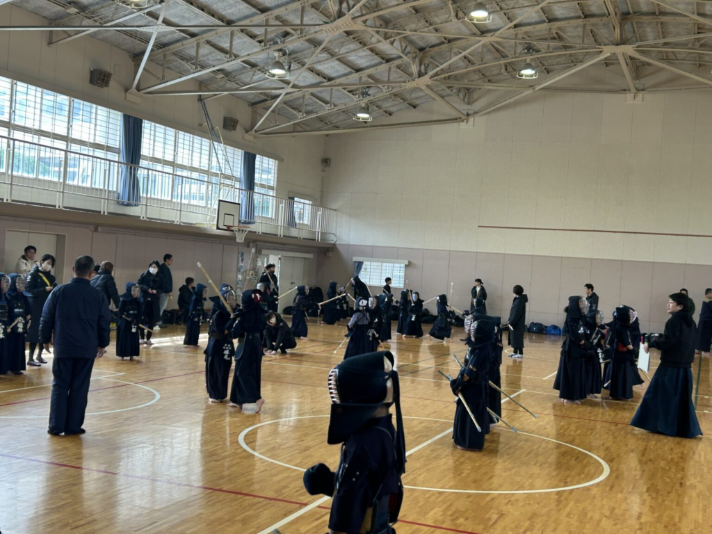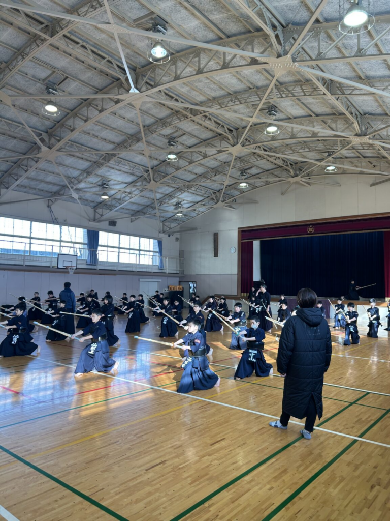 素振り、基本、技の稽古の後、試合稽古、先生方との地稽古、子供同士の地稽古を行いました。